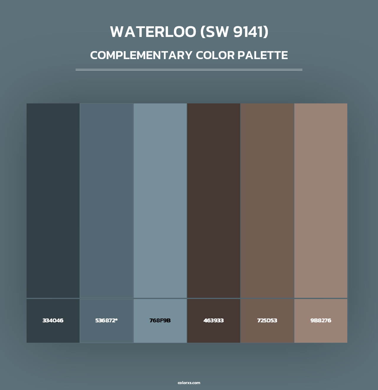Sherwin Williams Waterloo (SW 9141) Paint coordinating colors and palettes . Find what colors go with Sherwin Williams Waterloo (SW 9141) Paint coordinating colors and palettes . Explore monochromatic, analogous, complementary schemes. Inspiring color palette and combination for your next design.