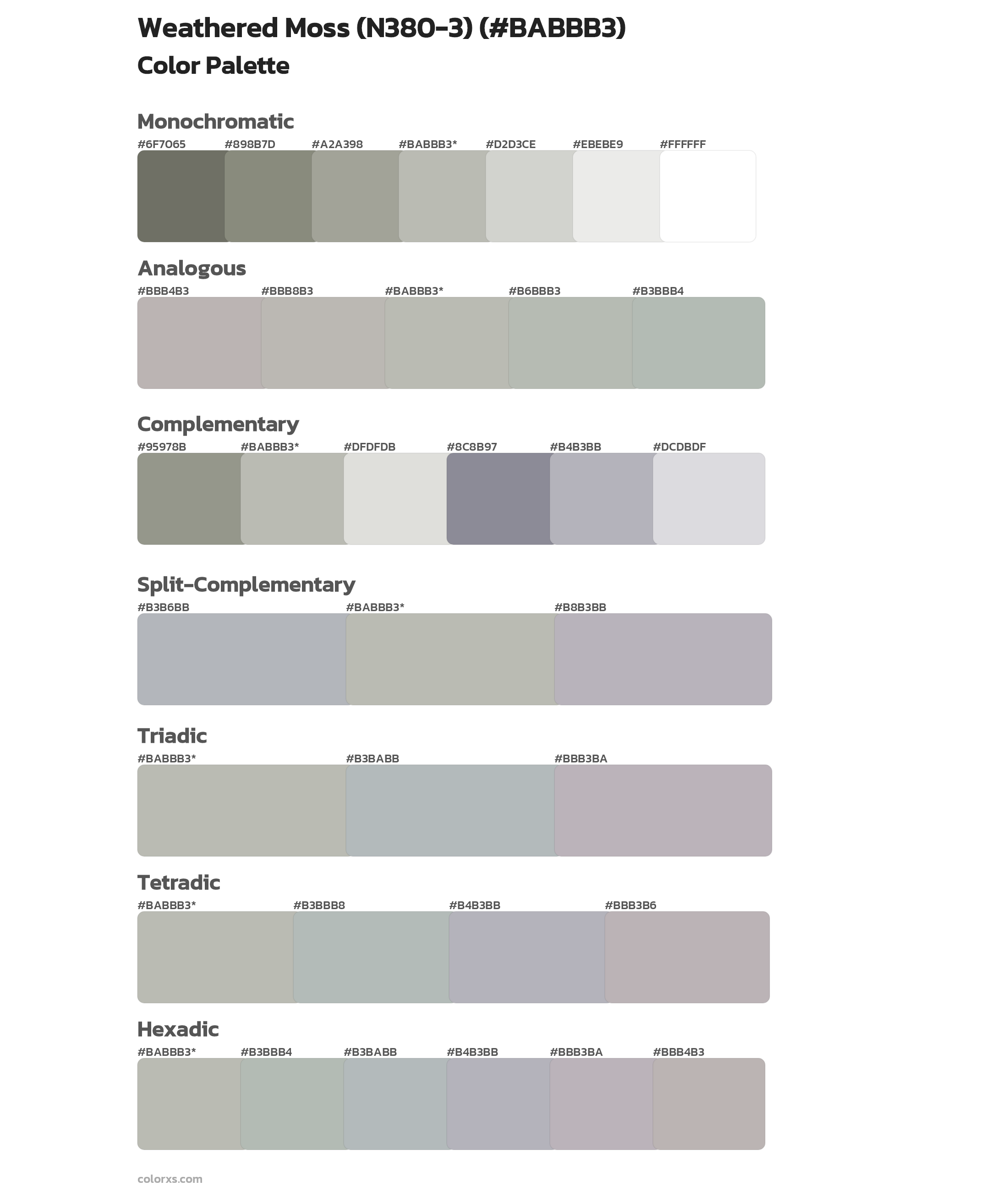 Behr Weathered Moss (N380-3) Paint coordinating colors and palettes . Find what colors go with Behr Weathered Moss (N380-3) Paint coordinating colors and palettes . Explore monochromatic, analogous, complementary schemes. Inspiring color palette and combination for your next design.
