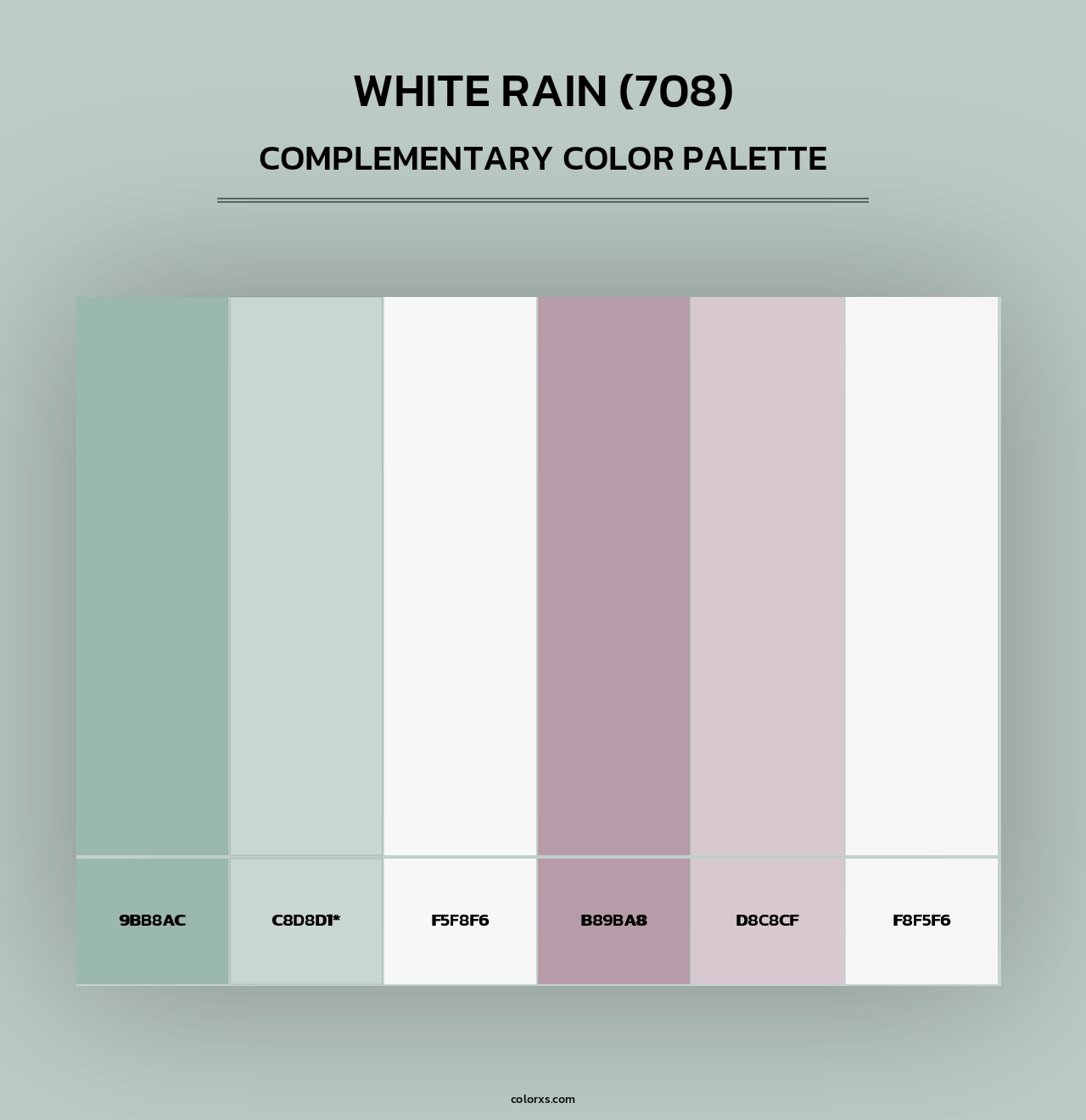 Benjamin Moore White Rain (708) Paint coordinating colors and palettes . Find what colors go with Benjamin Moore White Rain (708) Paint coordinating colors and palettes . Explore monochromatic, analogous, complementary schemes. Inspiring color palette and combination for your next design.