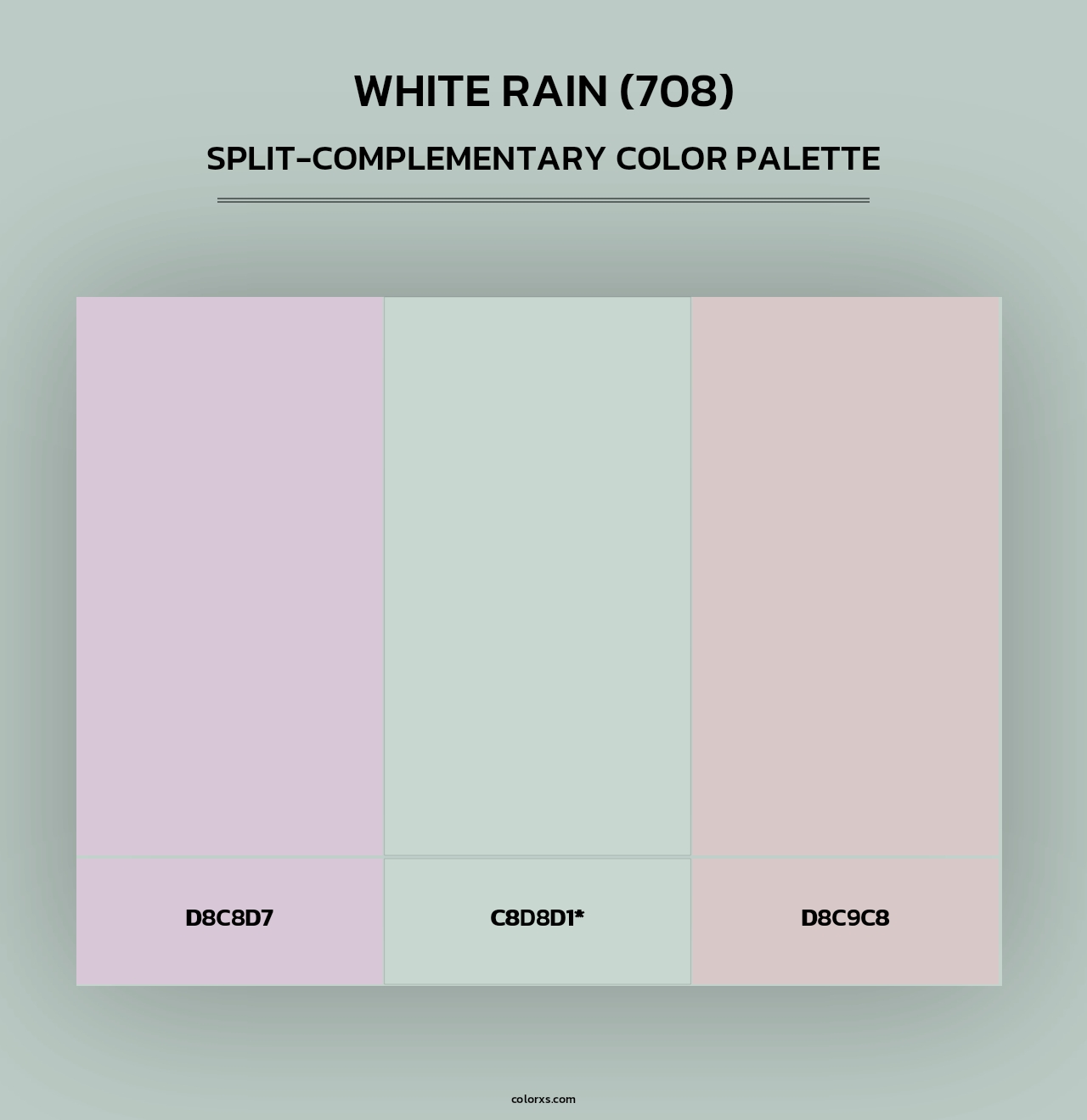Here is the Triadic and Tetradic Color Scheme of White Rain (708). The triadic color palette has three colors separated by 120° in the RGB color wheel and tetradic colour scheme composed of two sets of complementary colors in a rectangular shape on the color wheel.