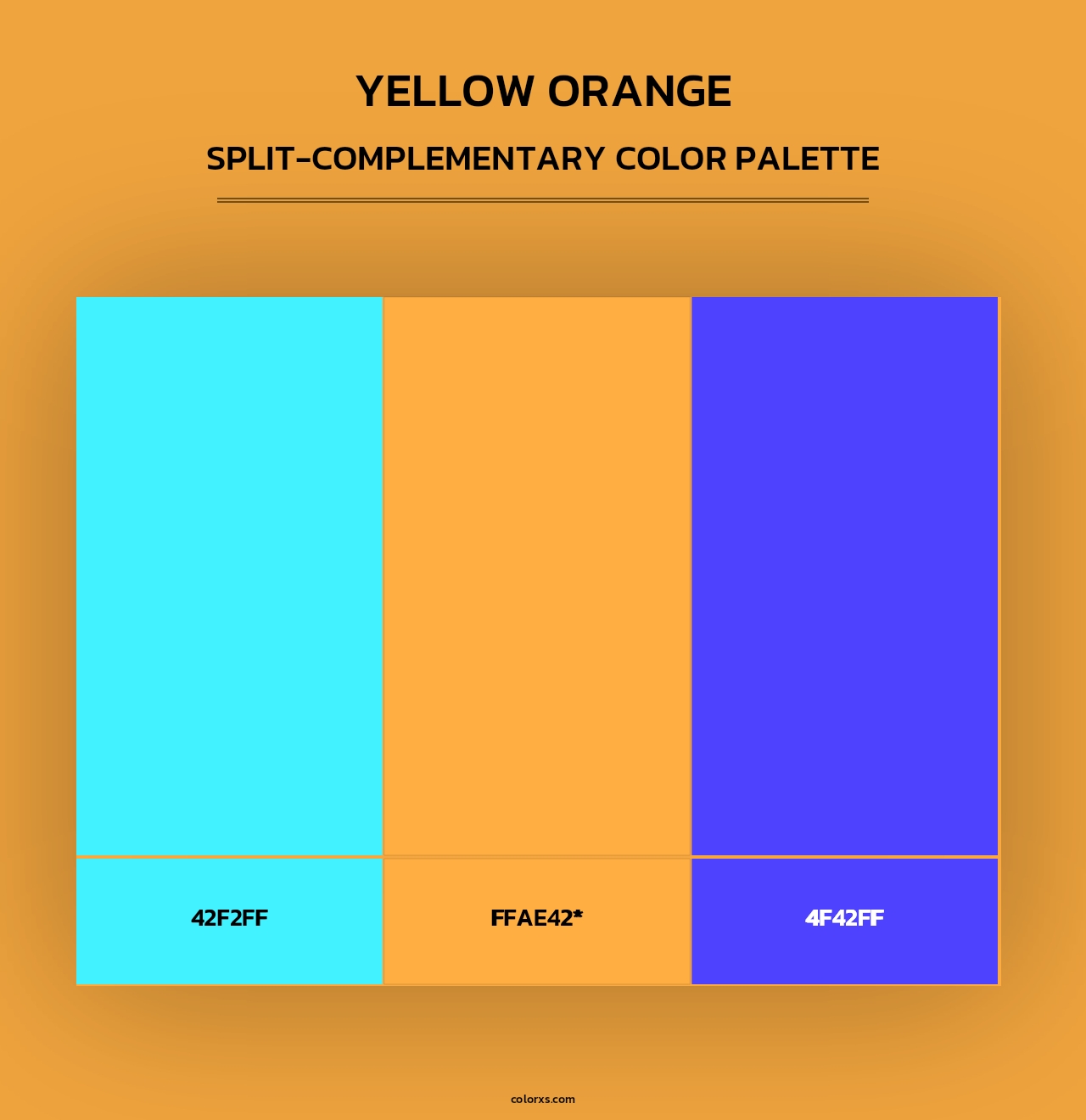 Here is the Triadic and Tetradic Color Scheme of Yellow Orange. The triadic color palette has three colors separated by 120° in the RGB color wheel and tetradic colour scheme composed of two sets of complementary colors in a rectangular shape on the color wheel.